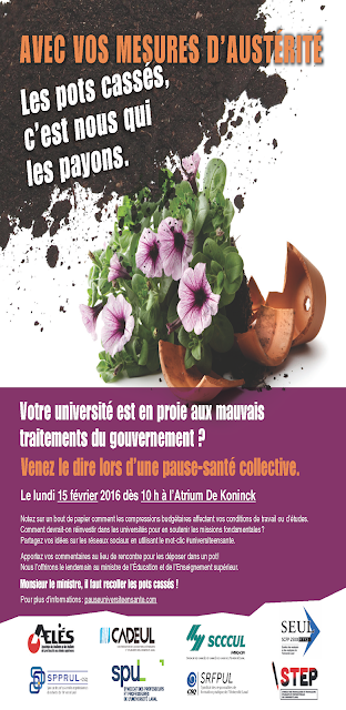 10 février 2016 – Pour faire suite aux mesures d’austérité imposées aux universités par le gouvernement Couillard, les syndicats membres de la Table des partenaires universitaires (TPU) proposent une autre Pause universités en santé le 15 février prochain, soulignant la St-Valentin.